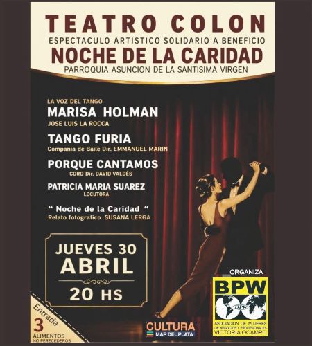 El próximo jueves 30 de abril, el emblemático Teatro Colón abrirá sus puertas para recibir al Espectáculo Artístico Solidario a beneficio de la «Noche de la Caridad de la Parroquia Asunción» organizado por BPW Asociación de Mujeres de Negocios y Profesionales Victoria Ocampo» El evento esta DECLARADO DE INTERÉS CULTURAL por el Ente Municipal de Turismo y Cultura EMTURyC.