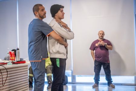 La fase práctica se divide en estaciones de trabajo, cada una con un instructor a cargo. Los cursantes realizan las maniobras sobre muñecos de simulación y aprenden el correcto uso de los DEA (Desfibrilador externo automático) a través del ejercicio en simuladores.